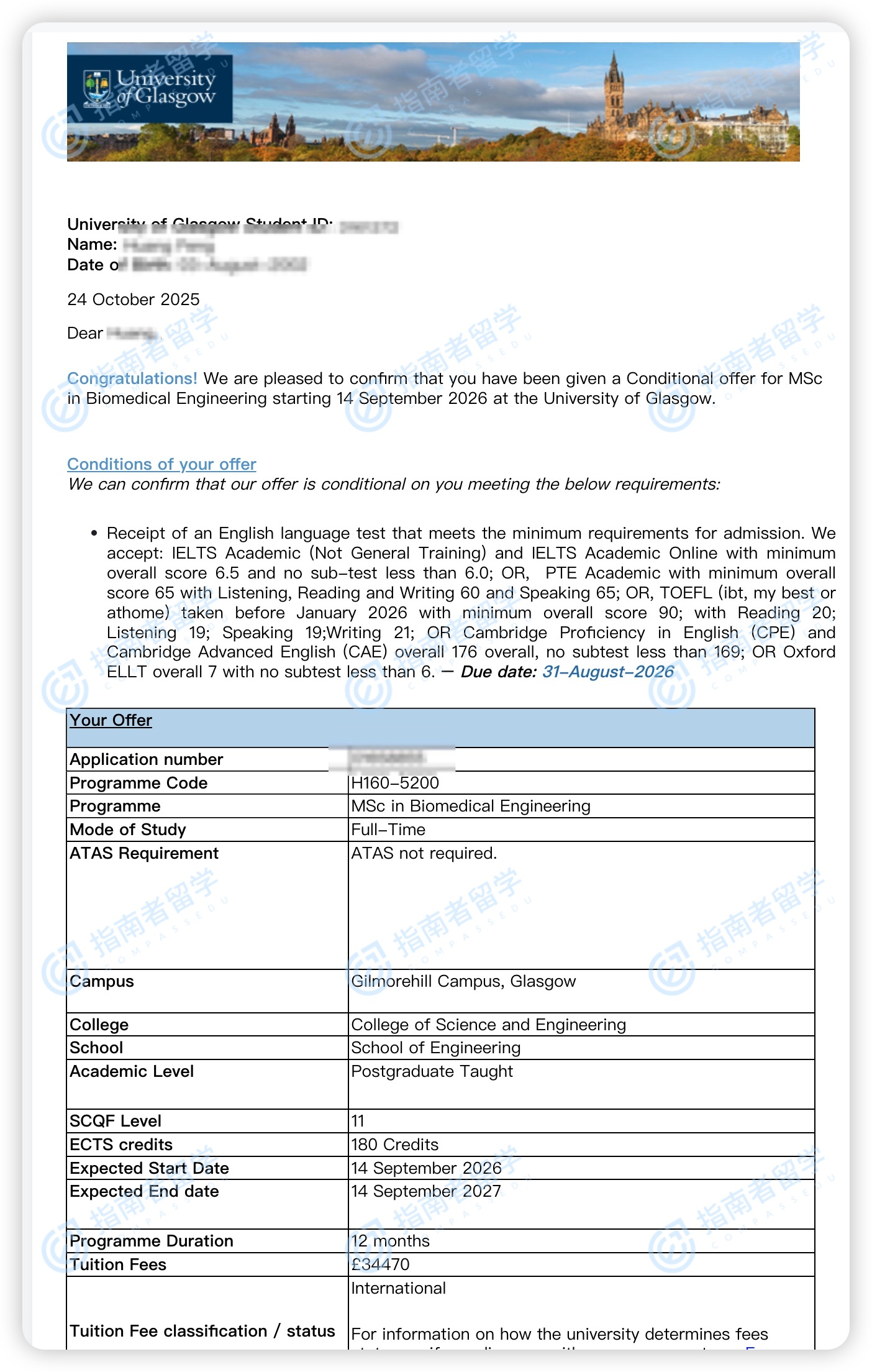 格拉斯哥大學(xué)生物醫(yī)學(xué)工程理學(xué)碩士研究生offer一枚