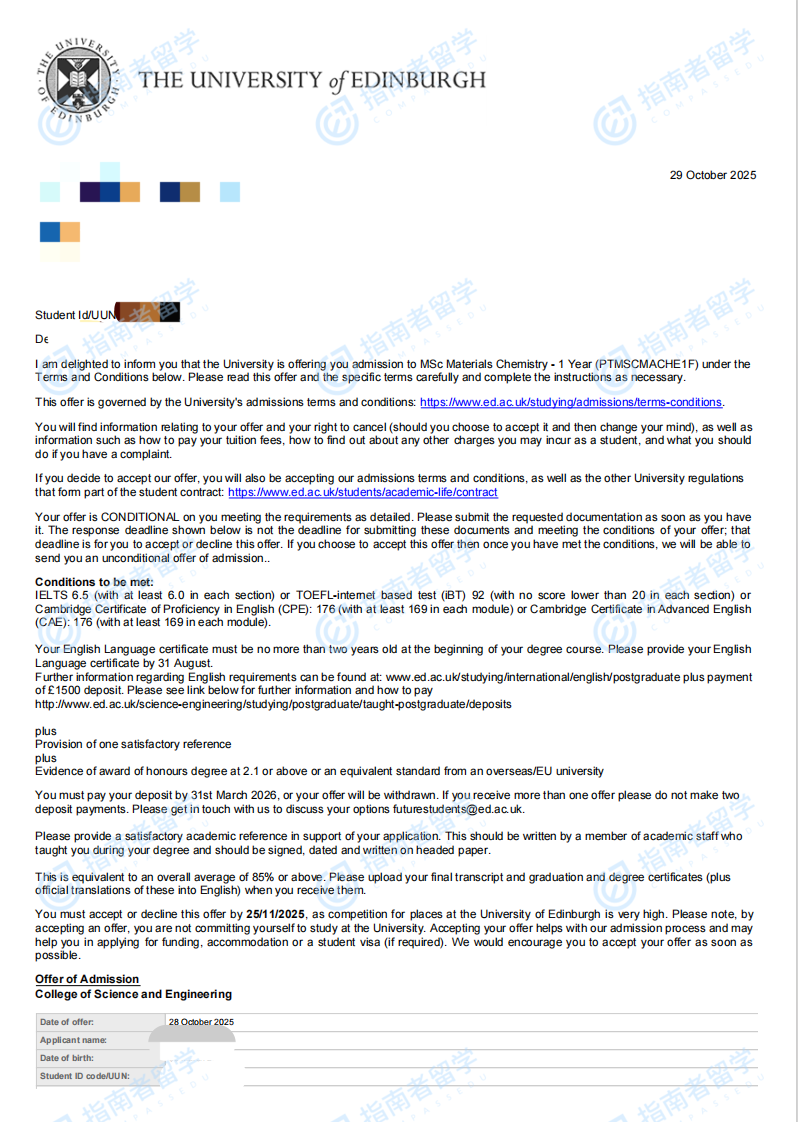 愛(ài)丁堡大學(xué)材料化學(xué)理學(xué)碩士研究生offer一枚