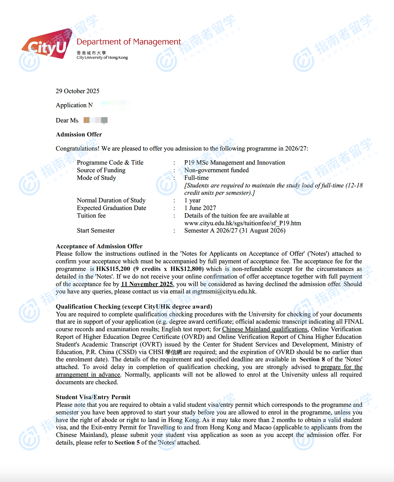 香港城市大學(xué)管理與創(chuàng)新理學(xué)碩士研究生offer一枚