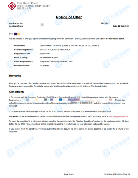 香港理工大學(xué)數(shù)據(jù)科學(xué)及分析理學(xué)碩士研究生offer一枚