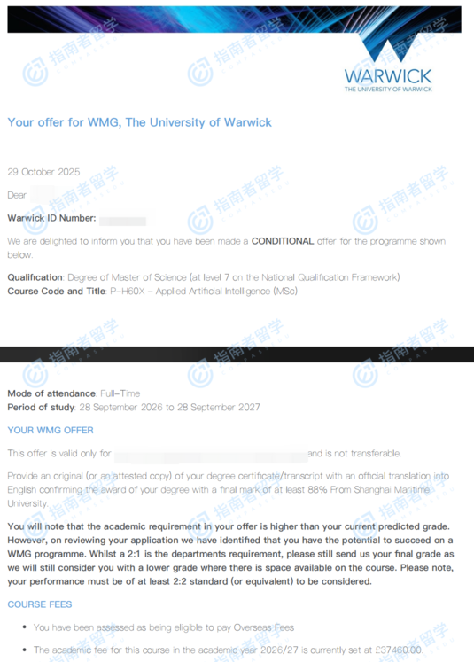 華威大學(xué)人工智能應(yīng)用理學(xué)碩士研究生offer一枚