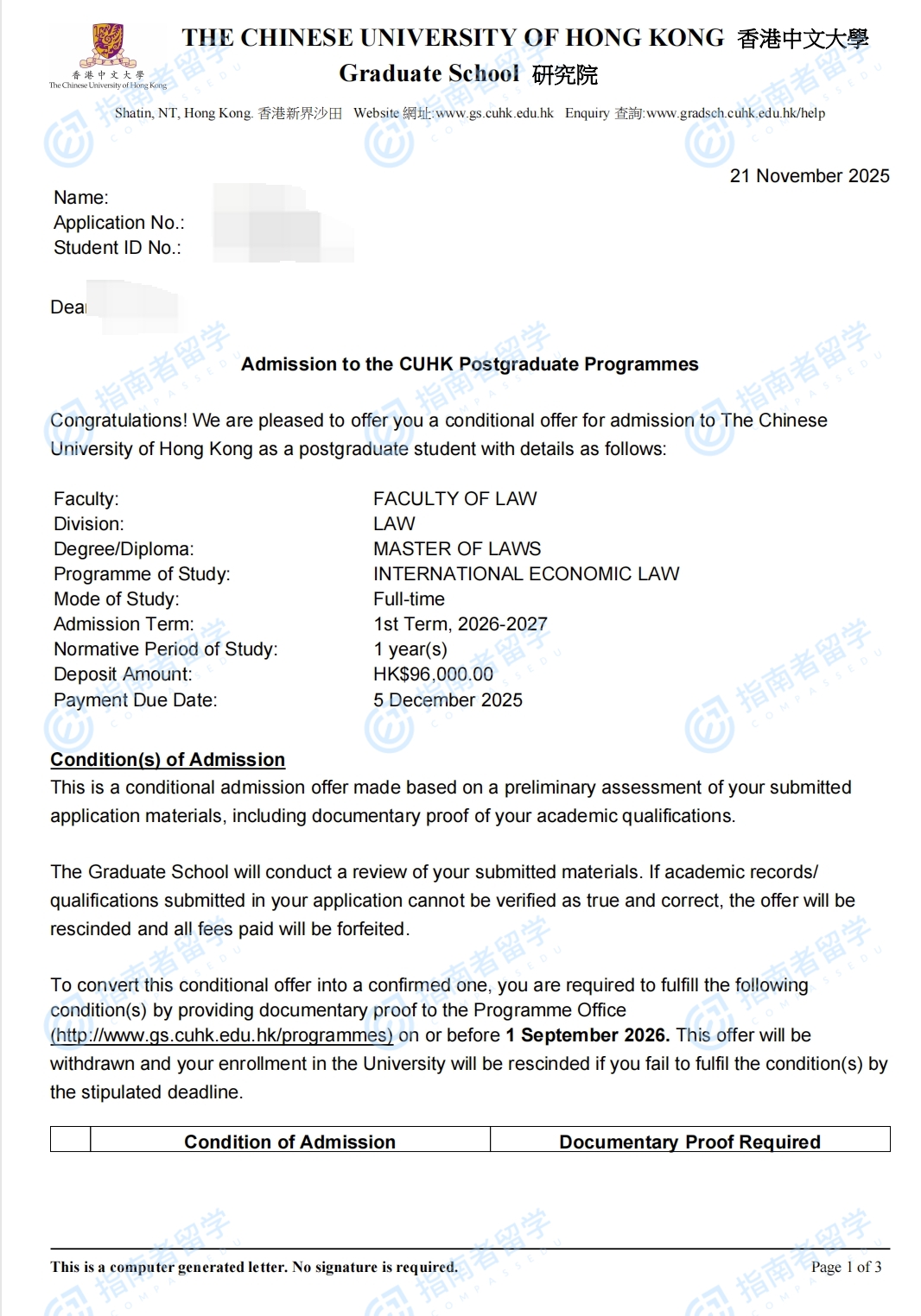 香港中文大學(xué)國(guó)際經(jīng)濟(jì)法法學(xué)碩士研究生offer一枚