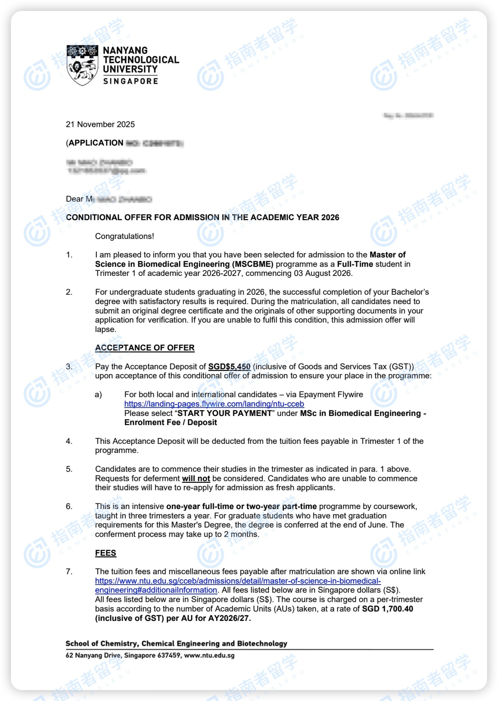 南洋理工大學(xué)生物醫(yī)學(xué)工程理學(xué)碩士研究生offer一枚