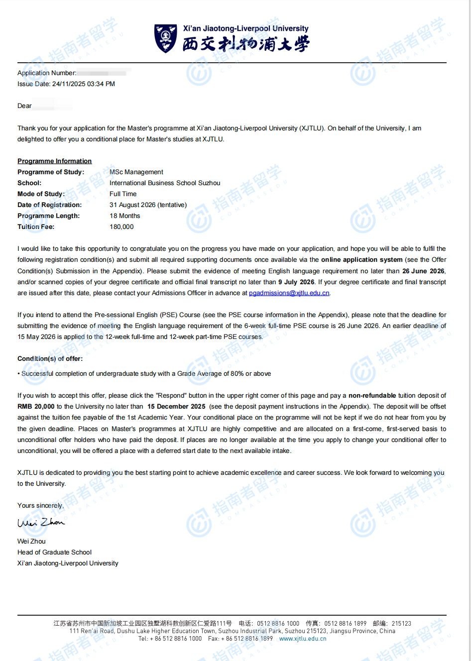 西交利物浦大學(xué)管理學(xué)理學(xué)碩士研究生offer一枚