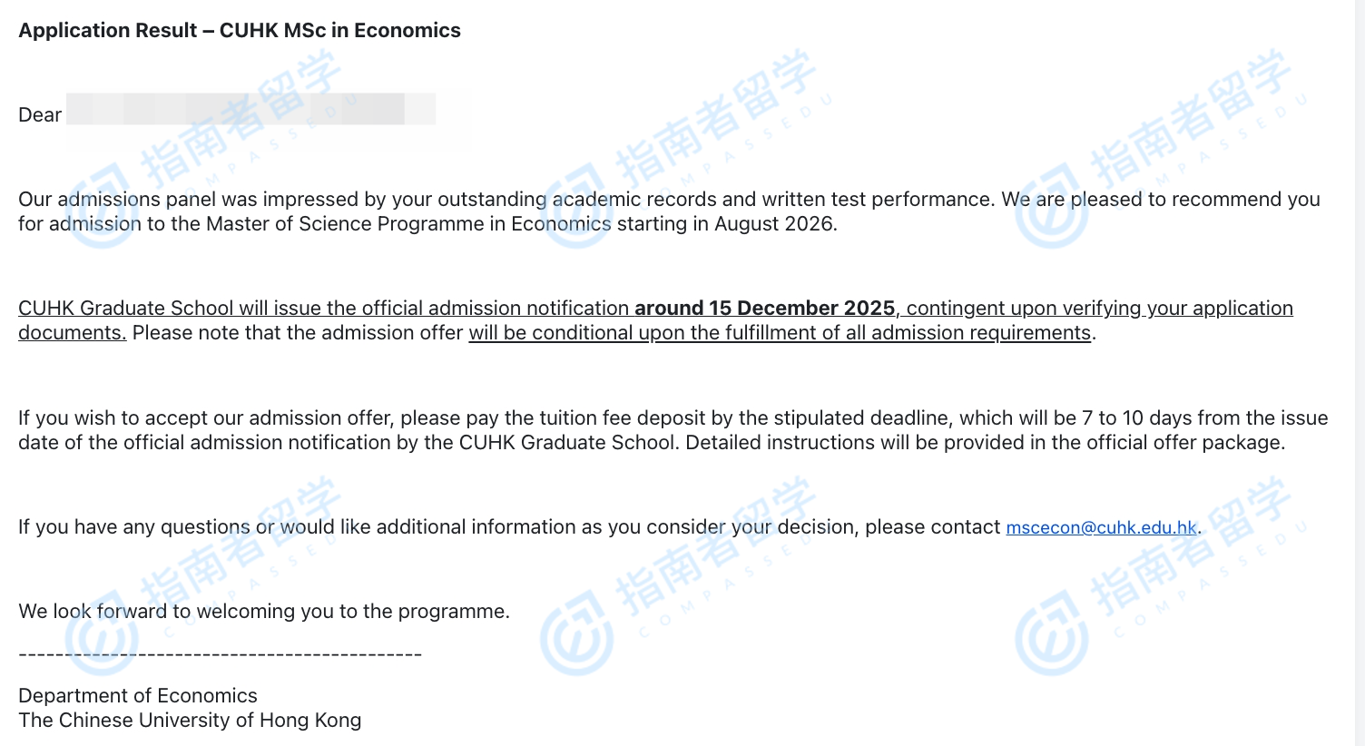 香港中文大學(xué)經(jīng)濟(jì)學(xué)理學(xué)碩士研究生offer一枚