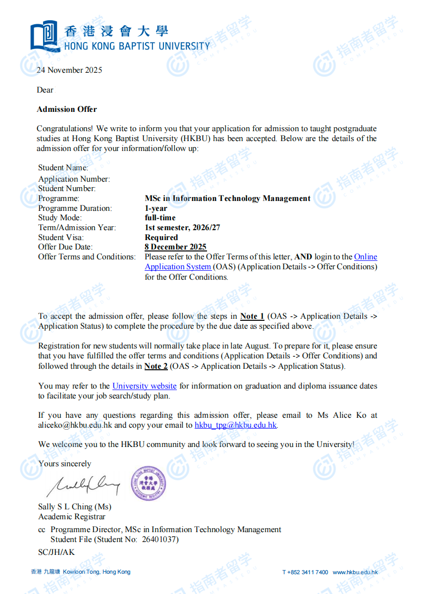 香港浸會大學(xué)資訊科技管理理學(xué)碩士研究生offer一枚