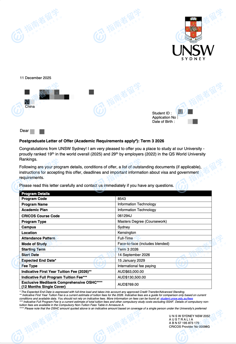 新南威爾士大學(xué)信息技術(shù)碩士研究生offer一枚