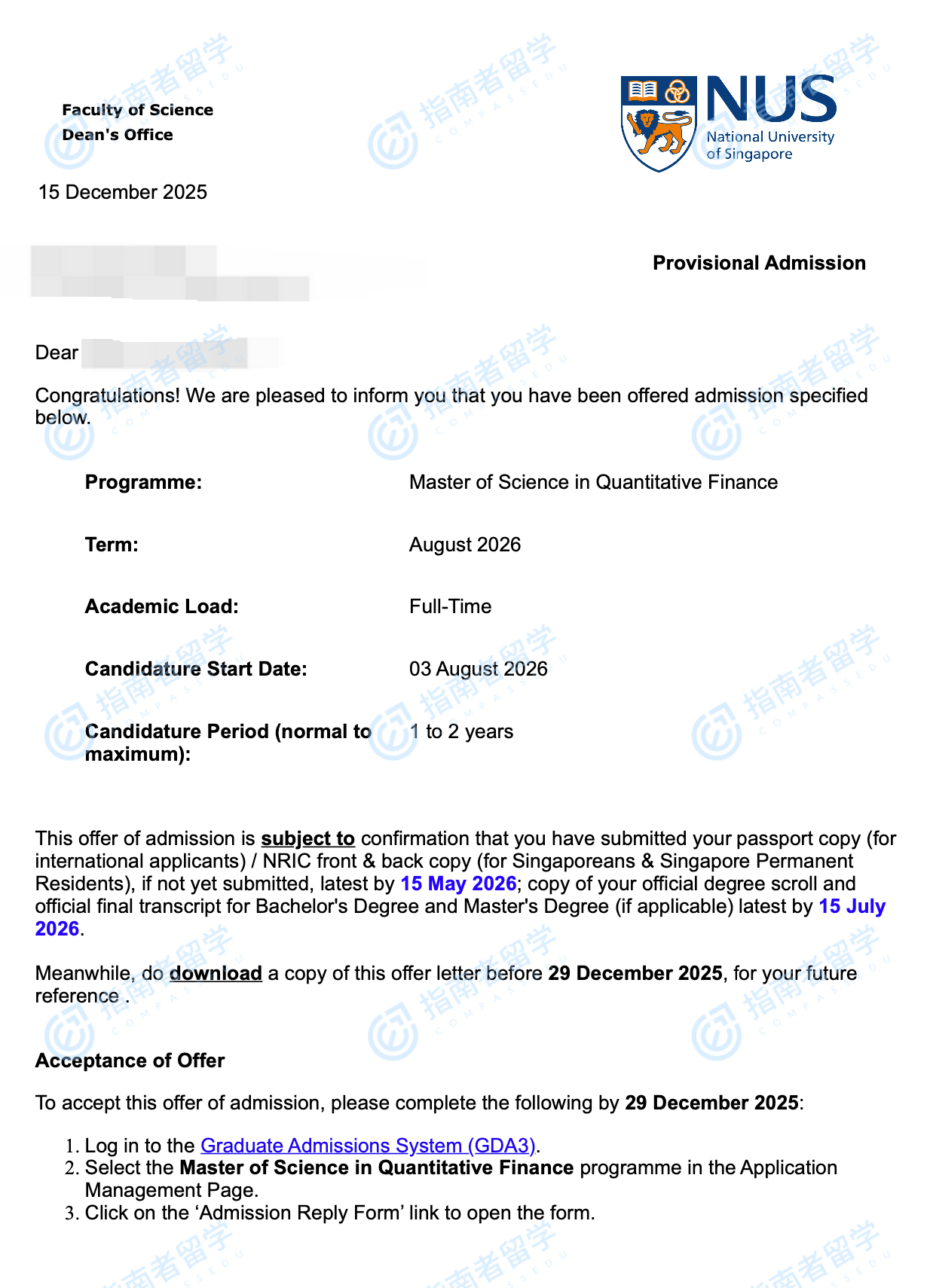 新加坡國立大學(xué)定量金融理學(xué)碩士研究生offer一枚