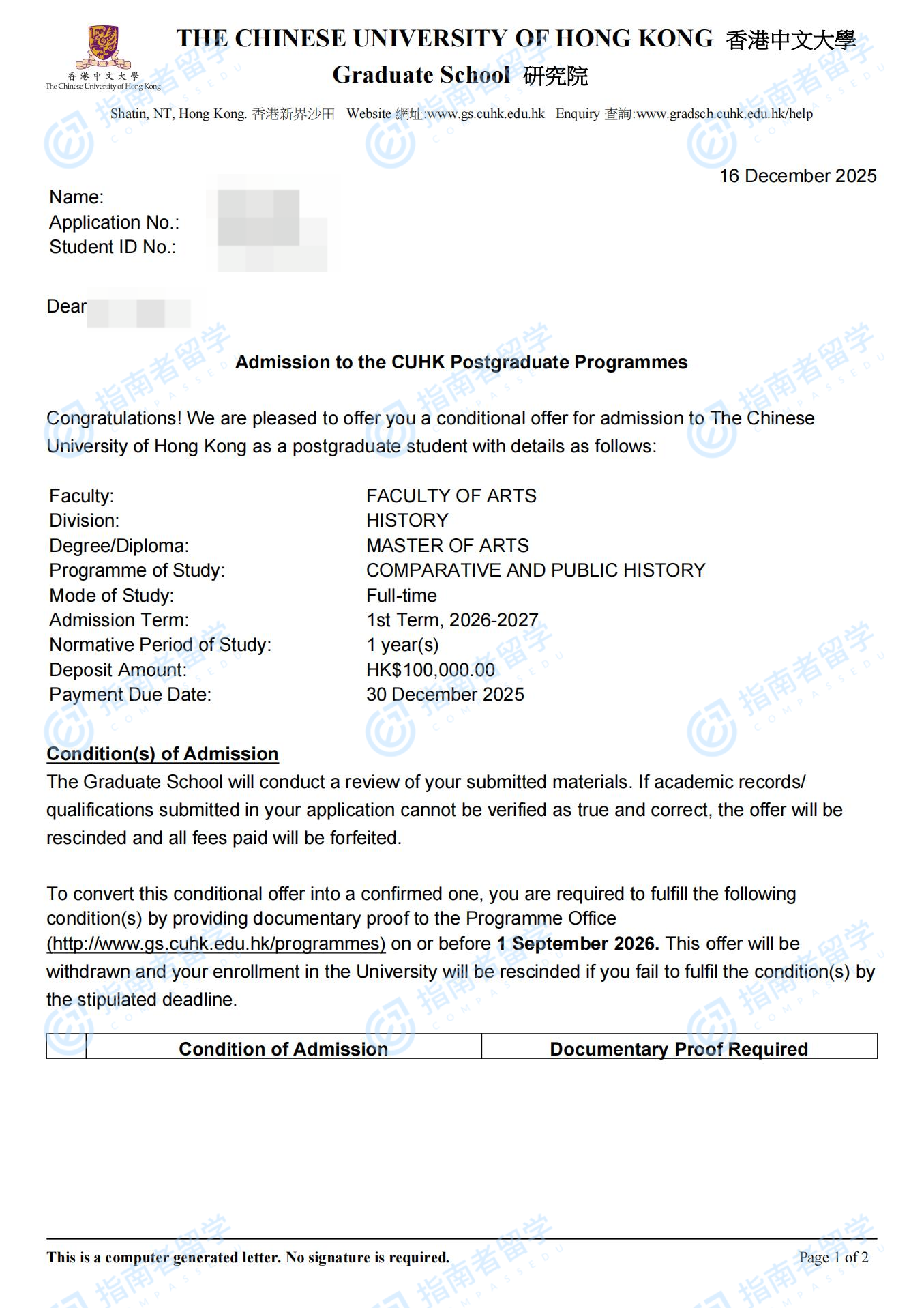 香港中文大學(xué)比較及公眾歷史學(xué)文學(xué)碩士研究生offer一枚