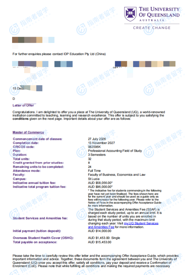 昆士蘭大學商學碩士(1.5年制)研究生offer一枚