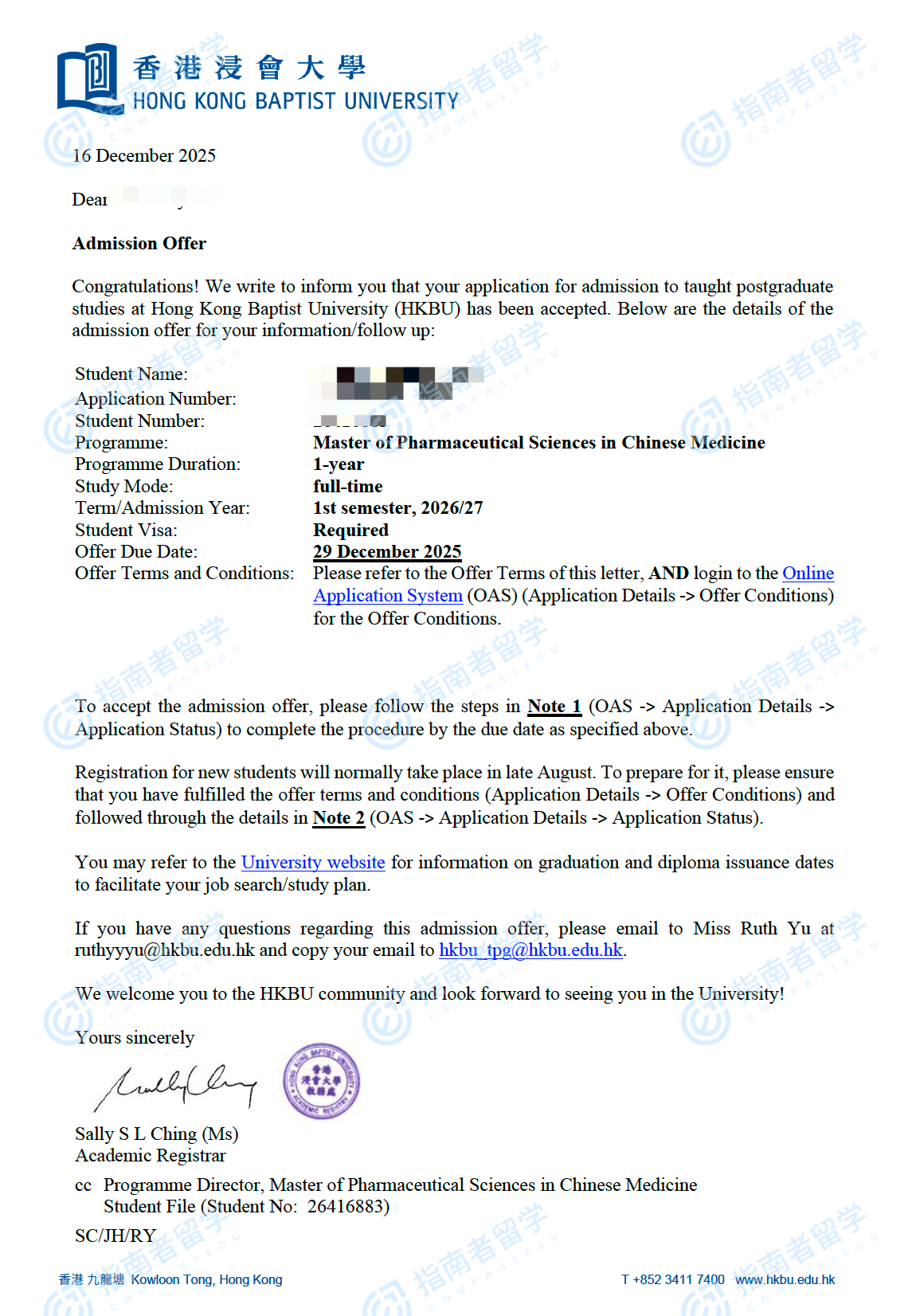 香港浸會(huì)大學(xué)中藥學(xué)碩士研究生offer一枚