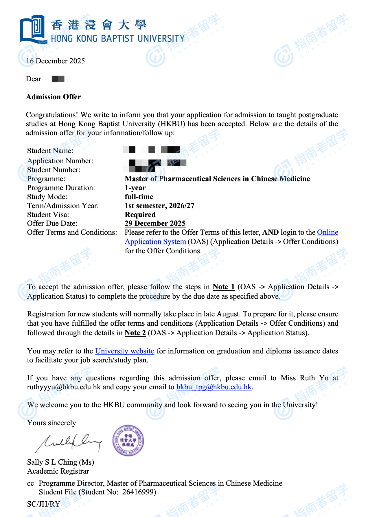 香港浸會大學(xué)中藥學(xué)碩士研究生offer一枚