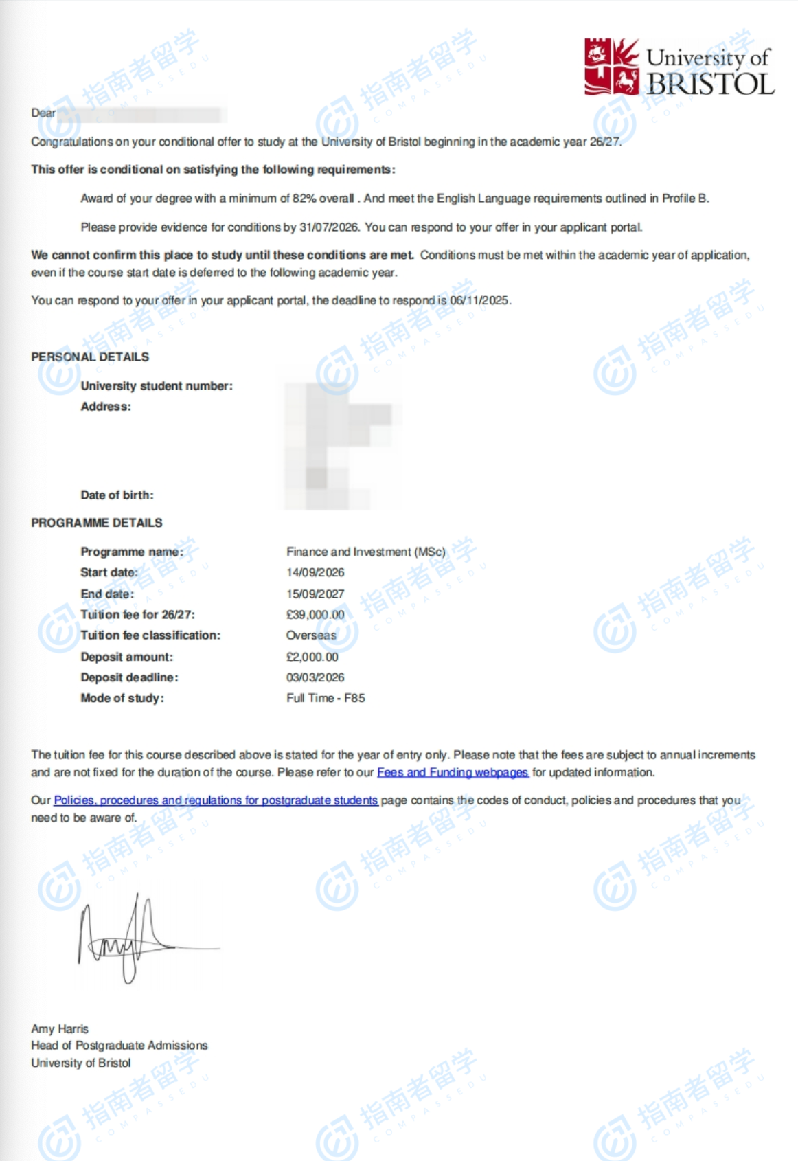布里斯托大學(xué)金融與投資理學(xué)碩士研究生offer一枚