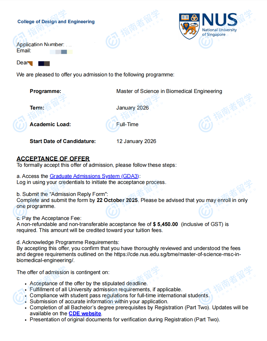 新加坡國立大學(xué)生物醫(yī)學(xué)工程理學(xué)碩士研究生offer一枚