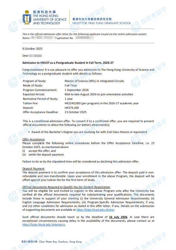 香港科技大學(xué)集成電路理學(xué)碩士研究生offer一枚
