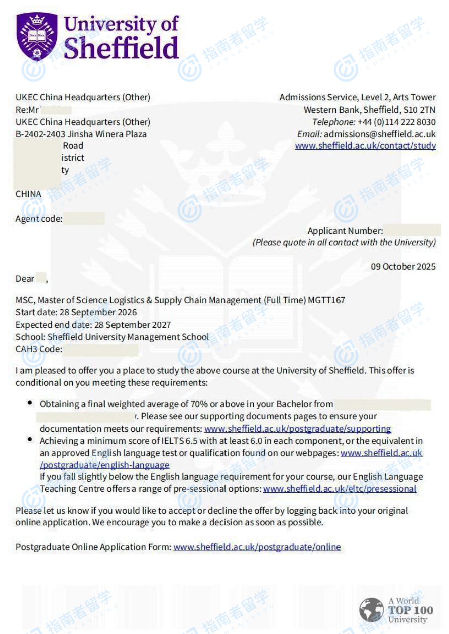 謝菲爾德大學物流與供應鏈管理理學碩士研究生offer一枚
