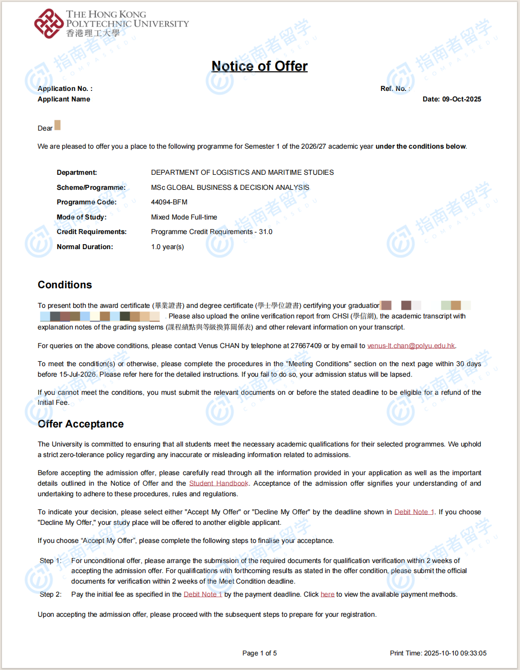 香港理工大學(xué)環(huán)球商業(yè)與決策分析理學(xué)碩士研究生offer一枚