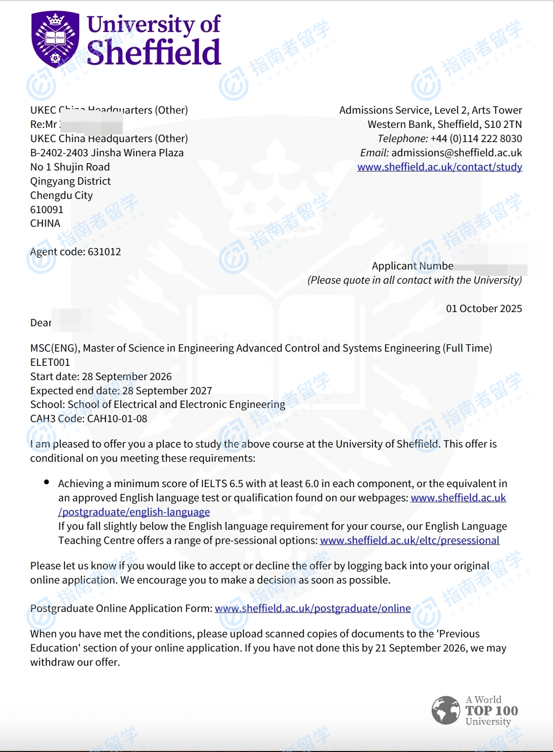 謝菲爾德大學(xué)高級(jí)控制與系統(tǒng)工程(工程)理學(xué)碩士研究生offer一枚