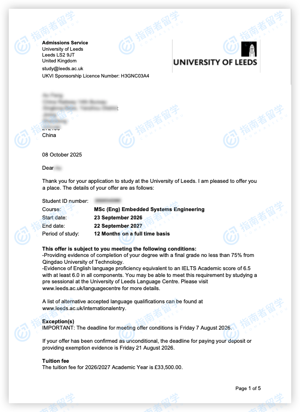 利茲大學(xué)嵌入式系統(tǒng)工程(工程)理學(xué)碩士研究生offer一枚