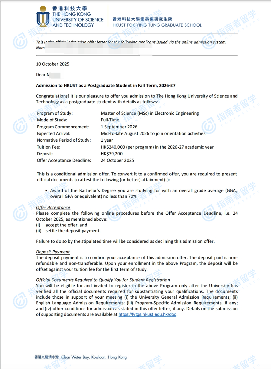 香港科技大學(xué)電子工程理學(xué)碩士研究生offer一枚