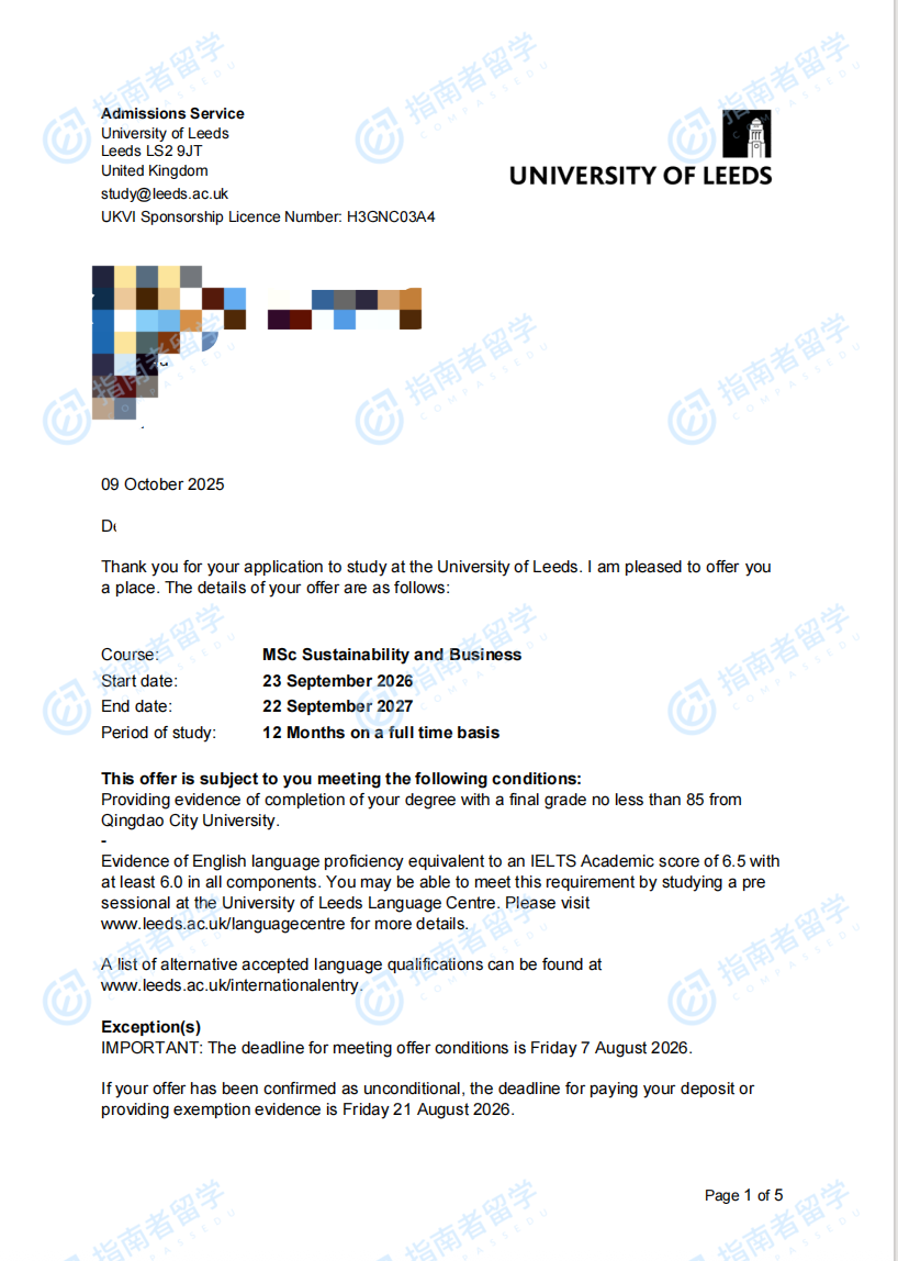 利茲大學(xué)可持續(xù)發(fā)展與商業(yè)理學(xué)碩士研究生offer一枚