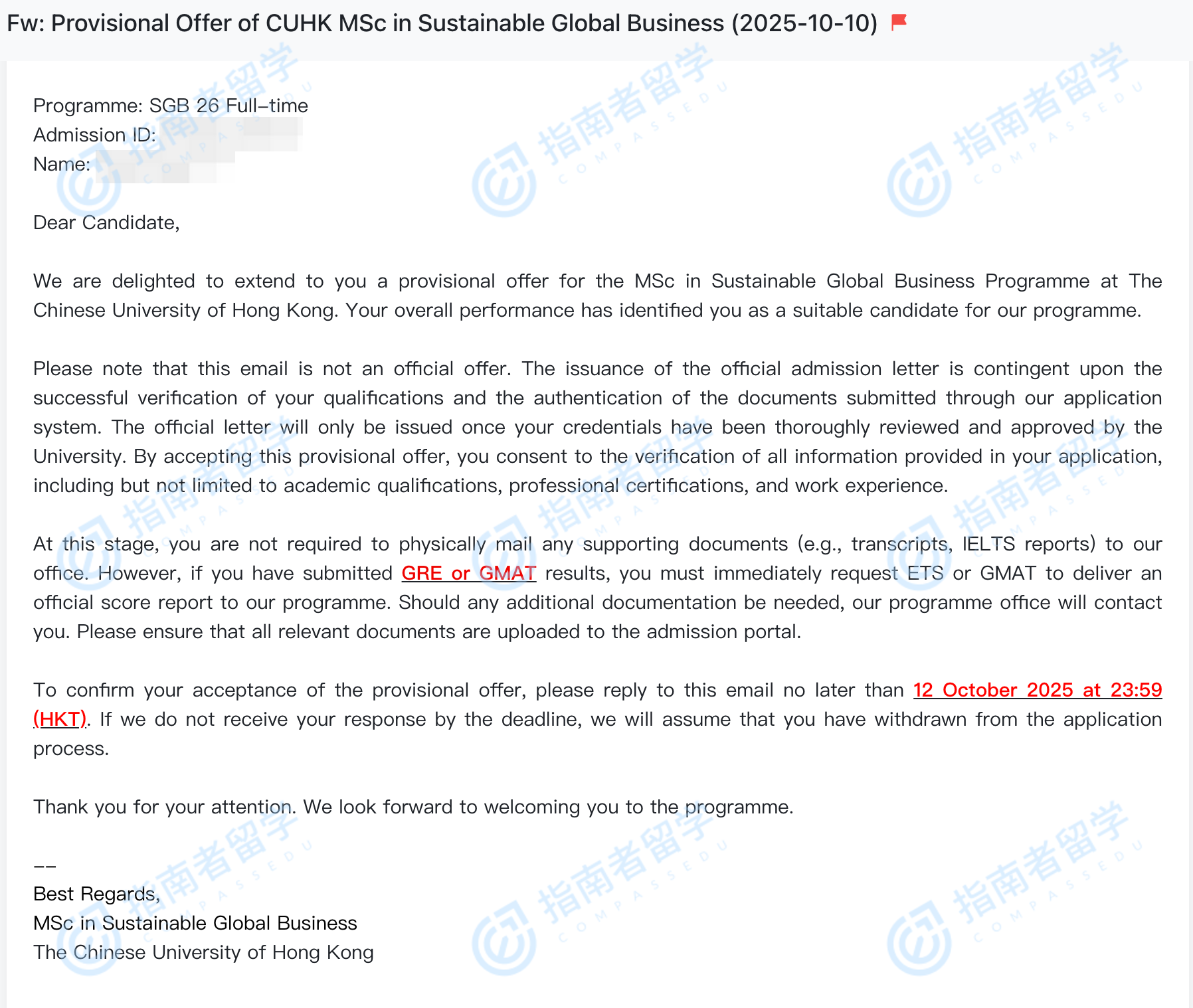 香港中文大學可持續(xù)環(huán)球商業(yè)理學碩士研究生offer一枚
