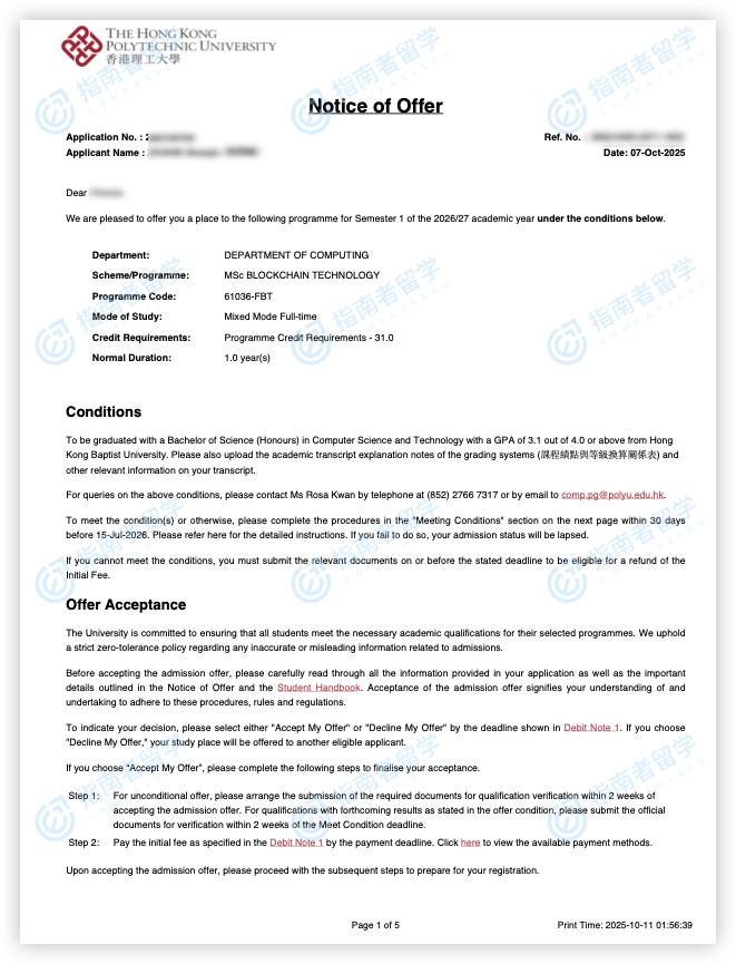 香港理工大學區(qū)塊鏈科技理學碩士研究生offer一枚