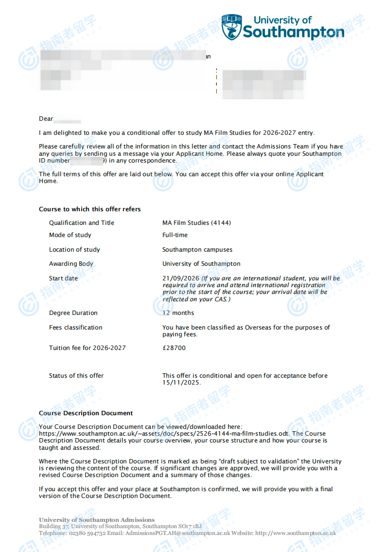 南安普頓大學(xué)電影研究文學(xué)碩士研究生offer一枚