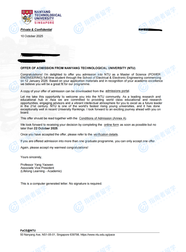 南洋理工大學(xué)電力工程理學(xué)碩士研究生offer一枚