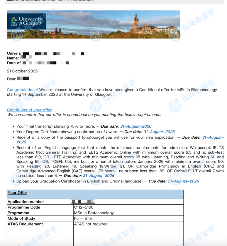 格拉斯哥大學(xué)生物技術(shù)理學(xué)碩士研究生offer一枚