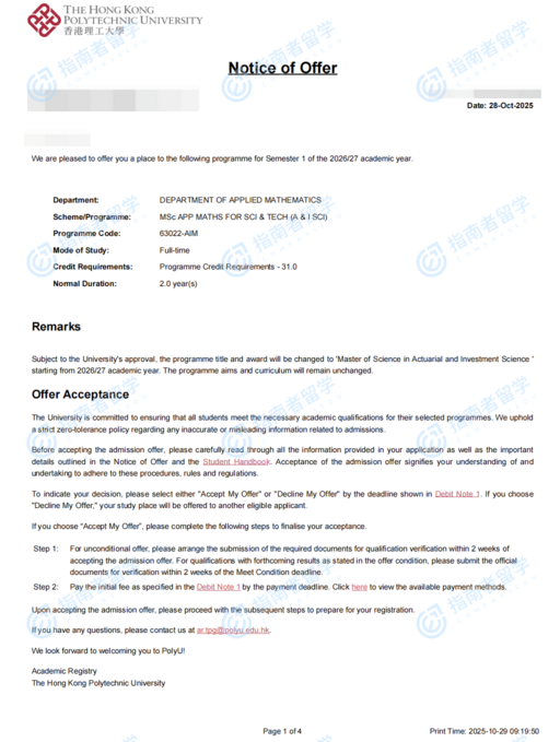 香港理工大學(xué)科技應(yīng)用數(shù)學(xué)(精算及投資科學(xué))理學(xué)碩士研究生offer一枚