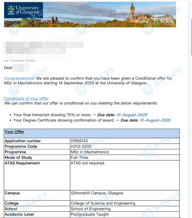 格拉斯哥大學(xué)機(jī)械電子學(xué)理學(xué)碩士研究生offer一枚