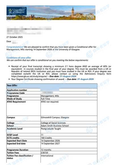 格拉斯哥大學(xué)管理學(xué)理學(xué)碩士研究生offer一枚
