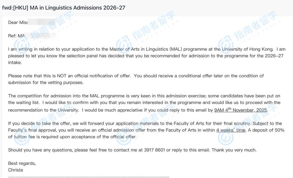 香港大學(xué)語言學(xué)文學(xué)碩士研究生offer一枚