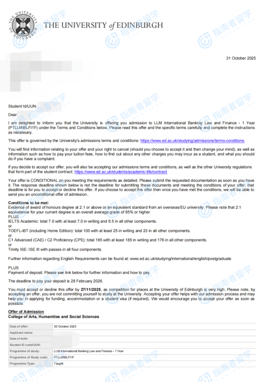 愛丁堡大學國際銀行法與金融法學碩士研究生offer一枚