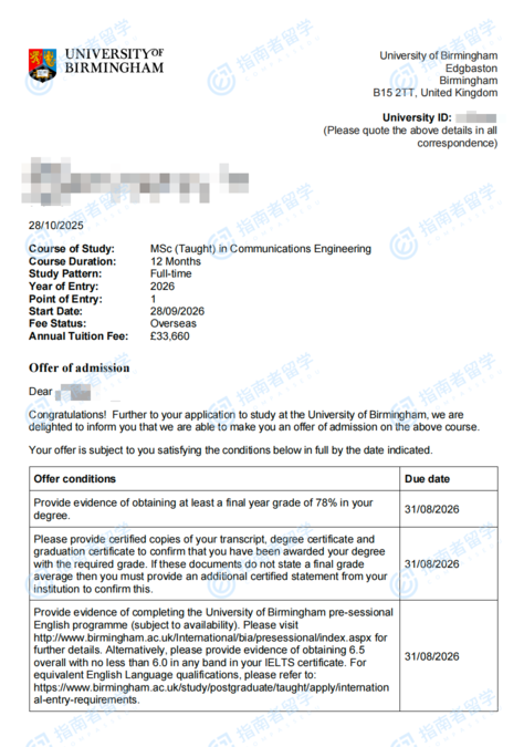 伯明翰大學(xué)通信工程理學(xué)碩士研究生offer一枚