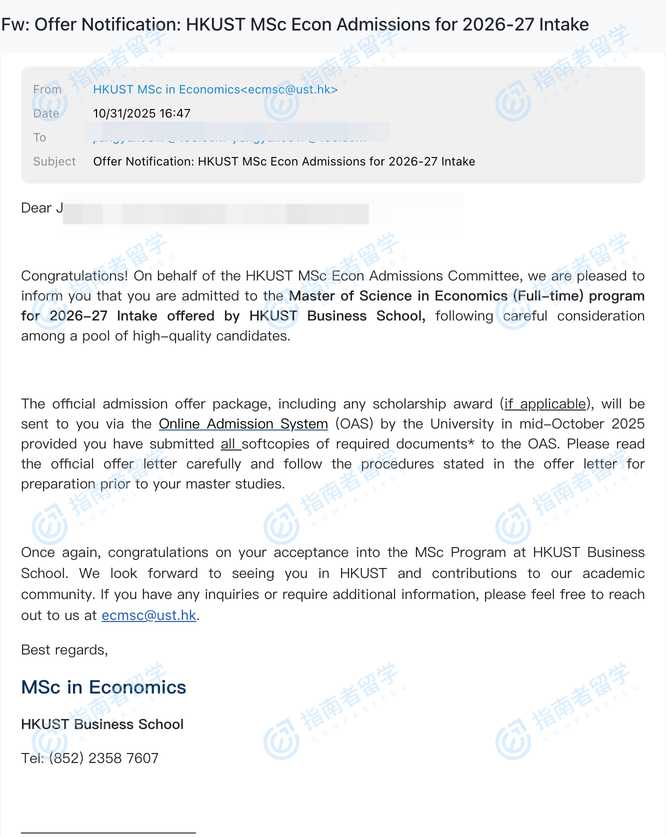 香港科技大學(xué)經(jīng)濟(jì)學(xué)理學(xué)碩士研究生offer一枚