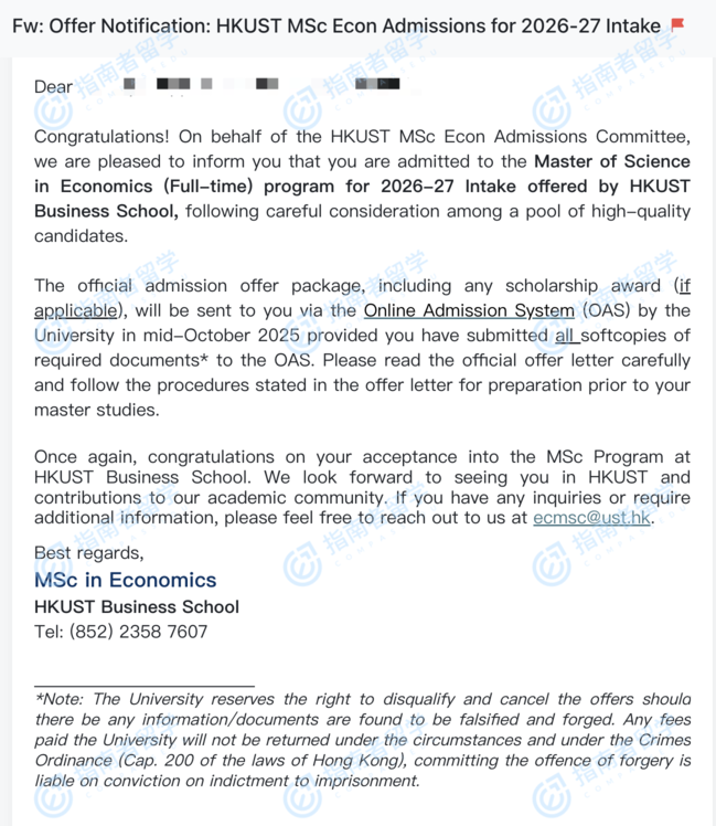 香港科技大學(xué)經(jīng)濟(jì)學(xué)理學(xué)碩士研究生offer一枚