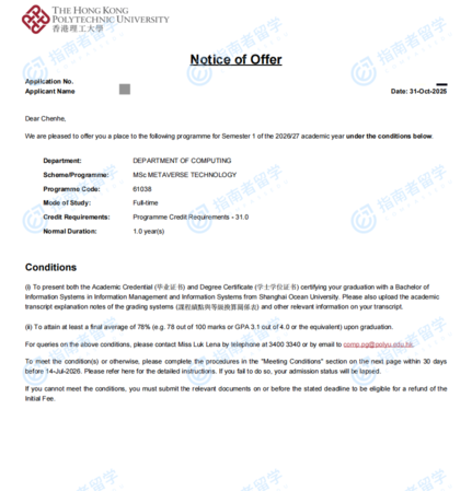 香港理工大學(xué)元宇宙科技理學(xué)碩士研究生offer一枚