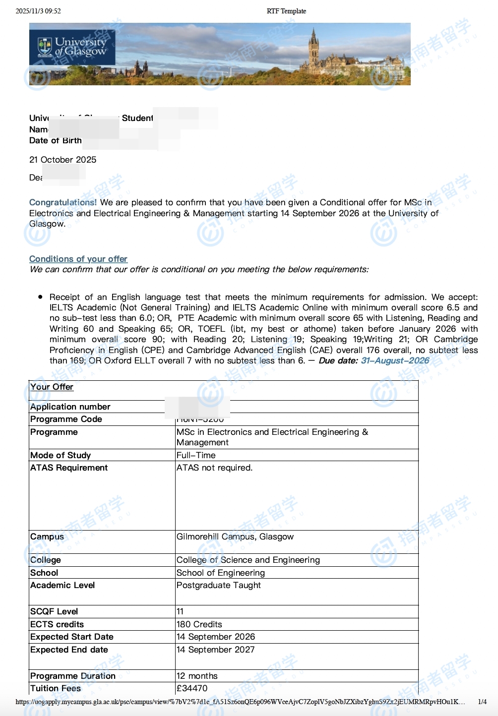 格拉斯哥大學(xué)電子電氣工程與管理理學(xué)碩士研究生offer一枚