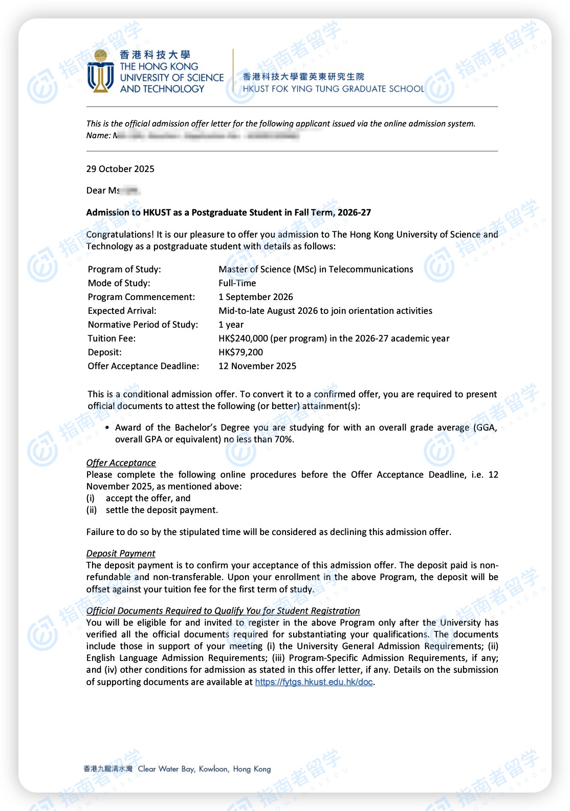 香港科技大學(xué)電信學(xué)理學(xué)碩士研究生offer一枚