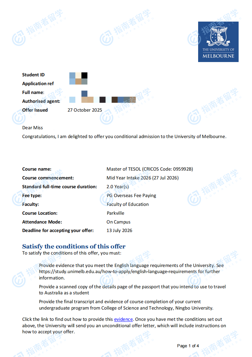 墨爾本大學(xué)對(duì)外英語教學(xué)碩士研究生offer一枚