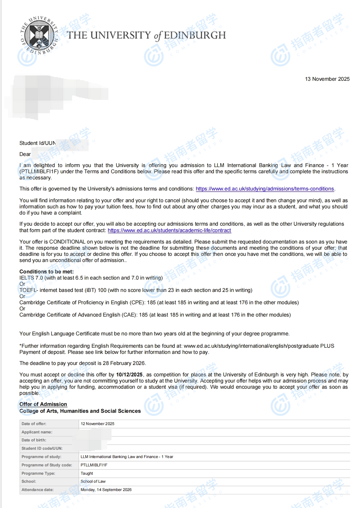 愛丁堡大學國際銀行法與金融法學碩士研究生offer一枚