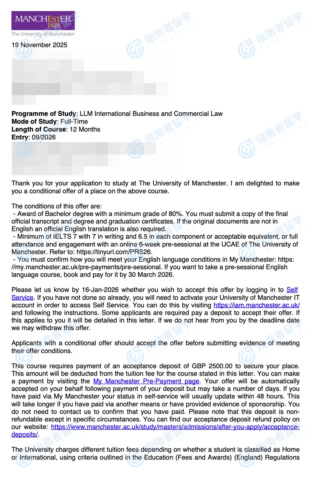 曼徹斯特大學(xué)國(guó)際商務(wù)與商法法學(xué)碩士研究生offer一枚