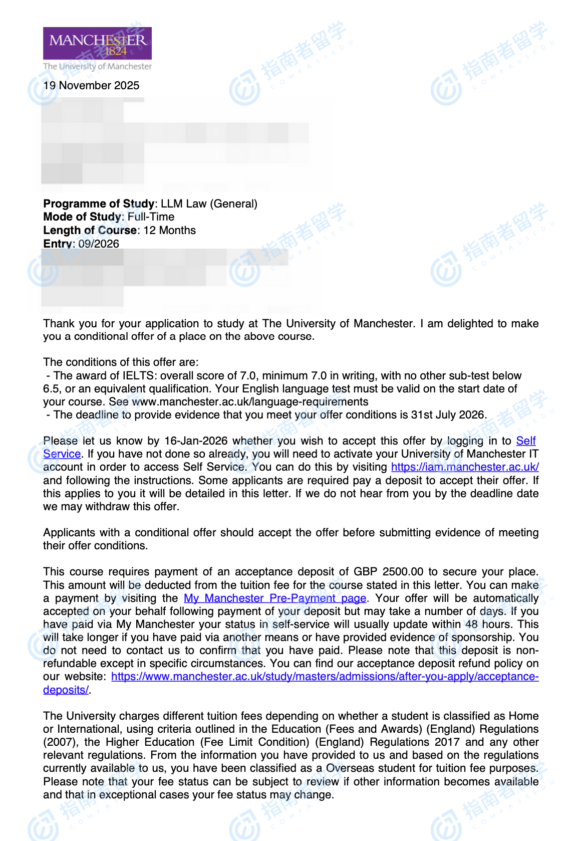 曼徹斯特大學(xué)法學(xué)碩士研究生offer一枚