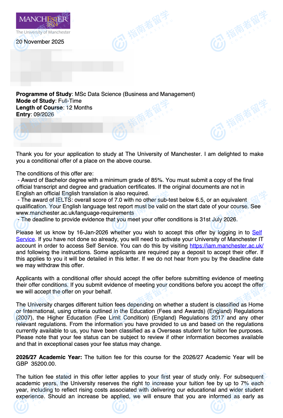 曼徹斯特大學數(shù)據(jù)科學(商業(yè)與管理)理學碩士研究生offer一枚