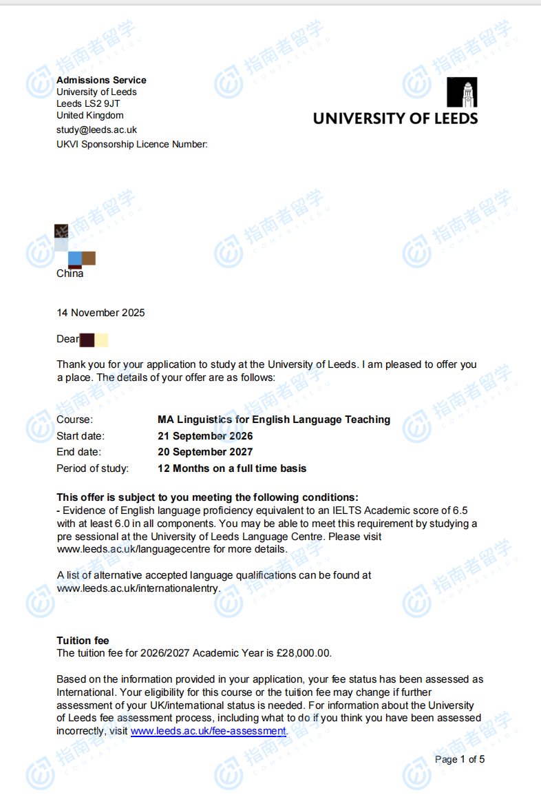 利茲大學語言學與英語語言教學文學碩士研究生offer一枚
