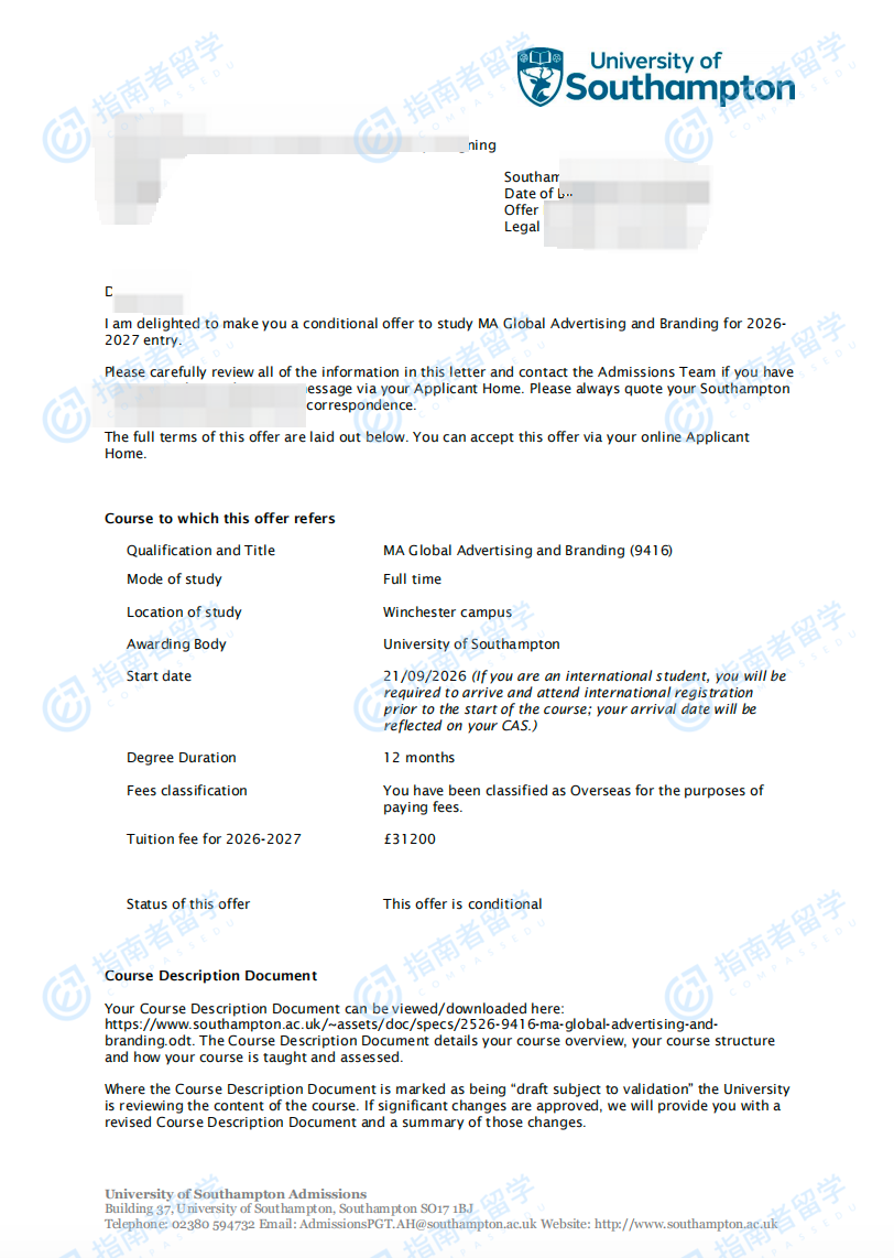 南安普頓大學(xué)全球廣告學(xué)與品牌文學(xué)碩士研究生offer一枚