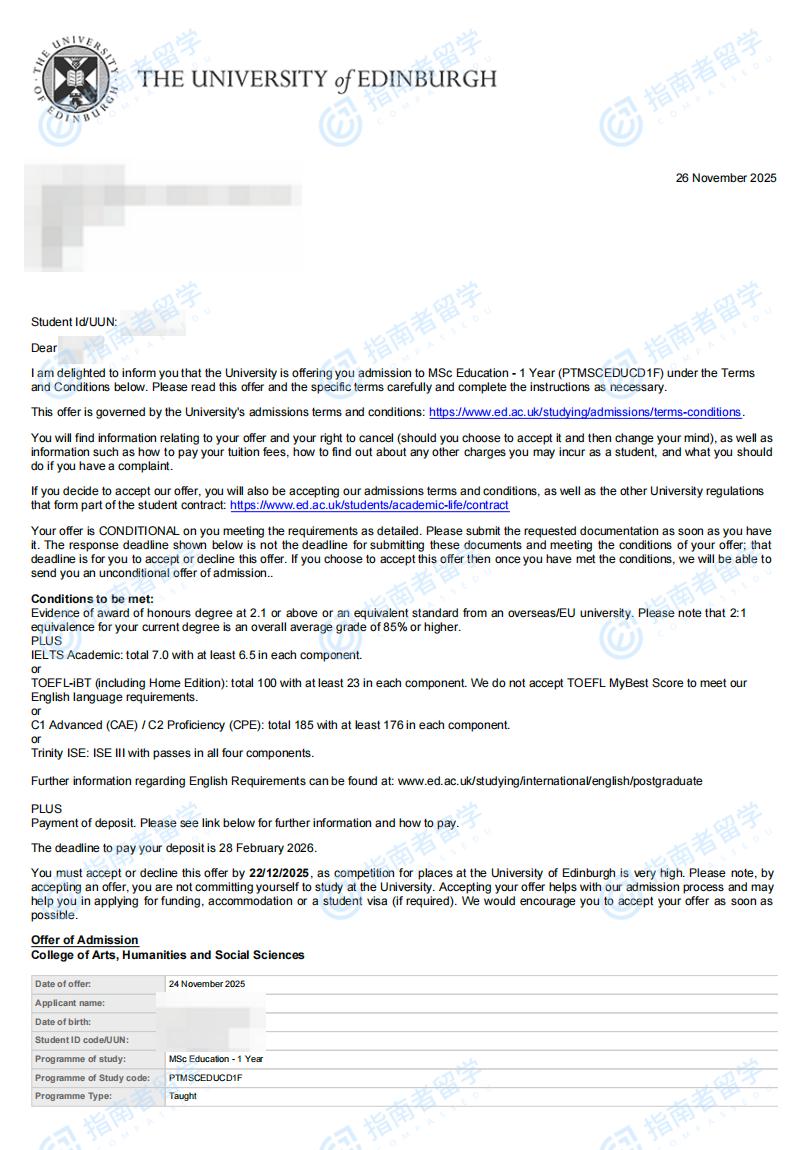愛丁堡大學(xué)教育學(xué)理學(xué)碩士研究生offer一枚