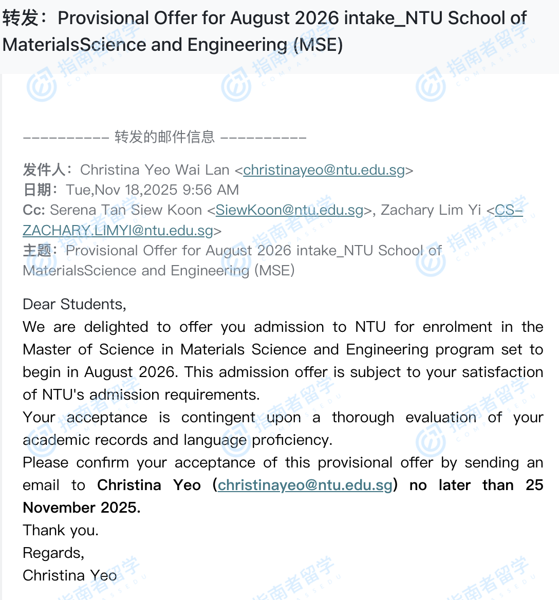南洋理工大學(xué)材料科學(xué)與工程理學(xué)碩士研究生offer一枚